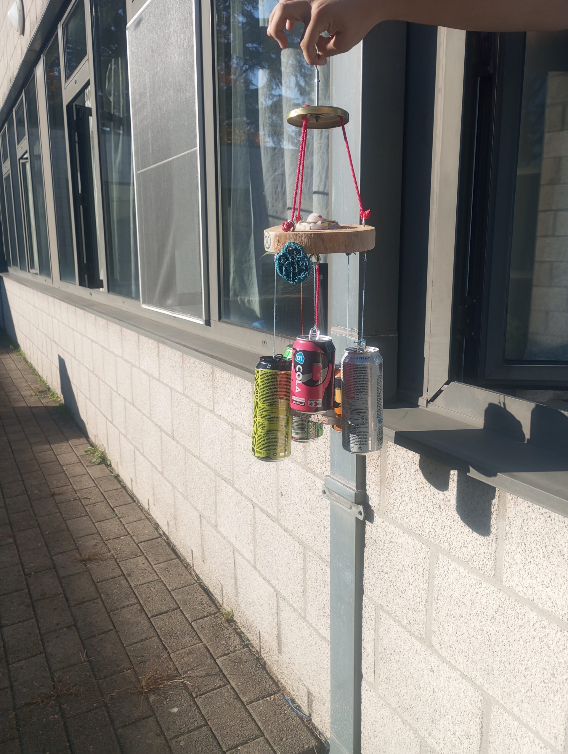 We hebben alle materialen verzameld: blikjes, houten schijf, touw, steentjes, deksels...