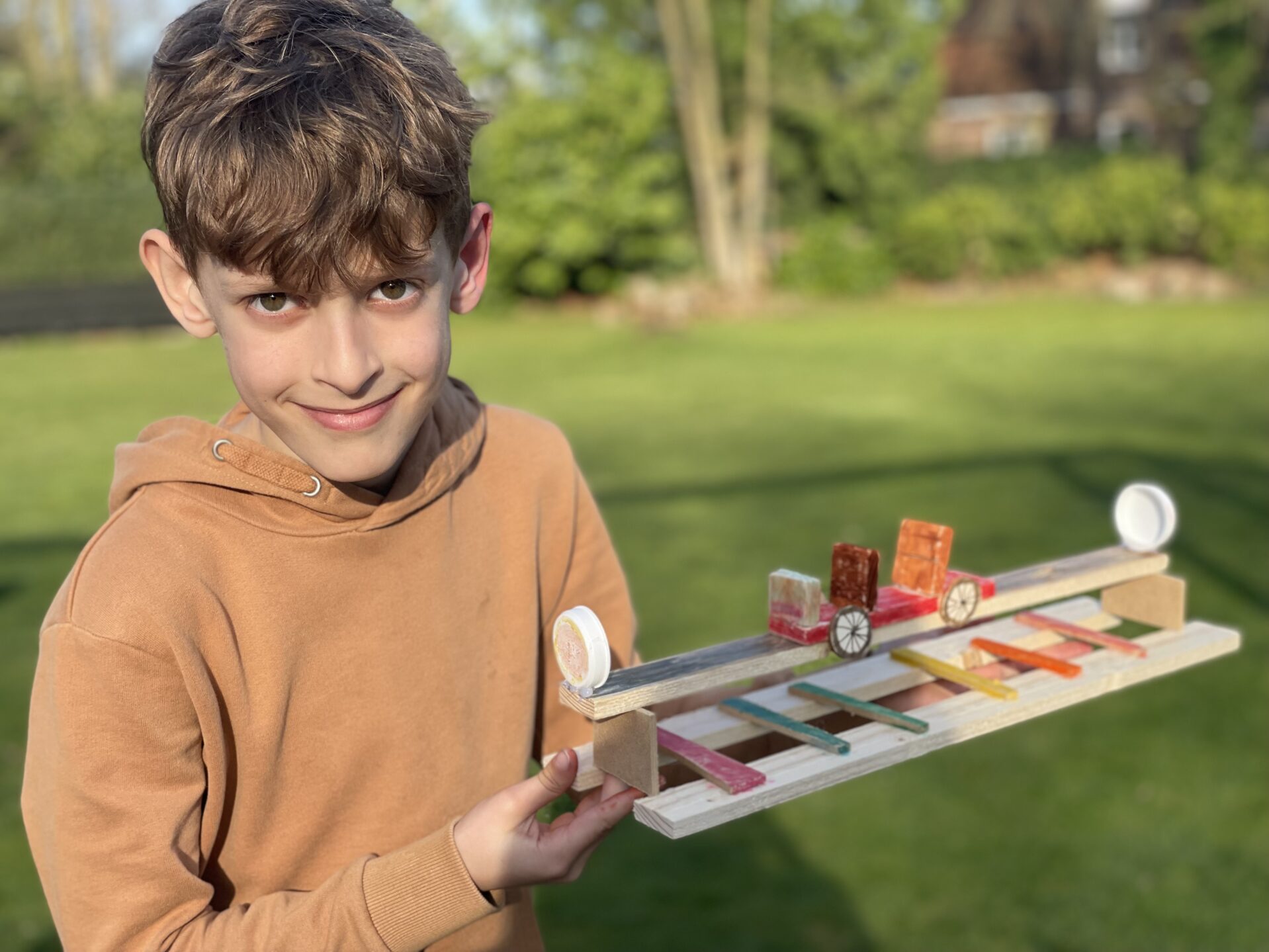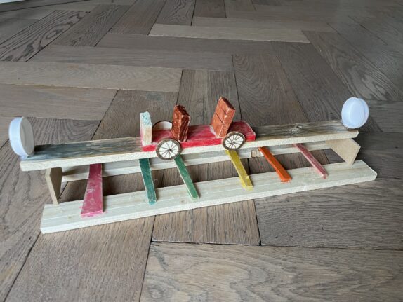 Het is een auto die over de regenboogbaan kan rijden heen en weer. Eventueel nog bewegingsenergie opwekken. En ook leuk als speelgoed voor kinderen.