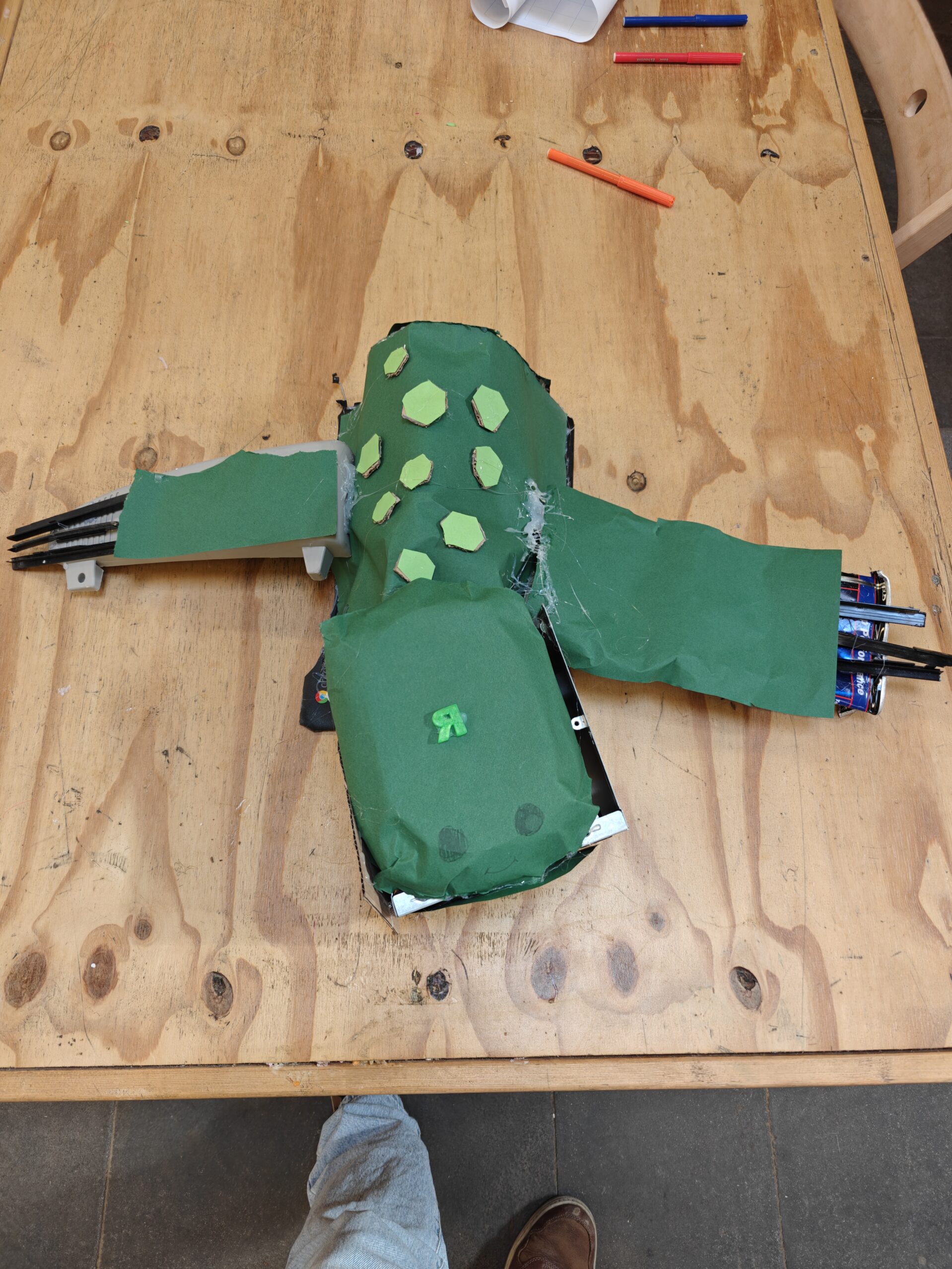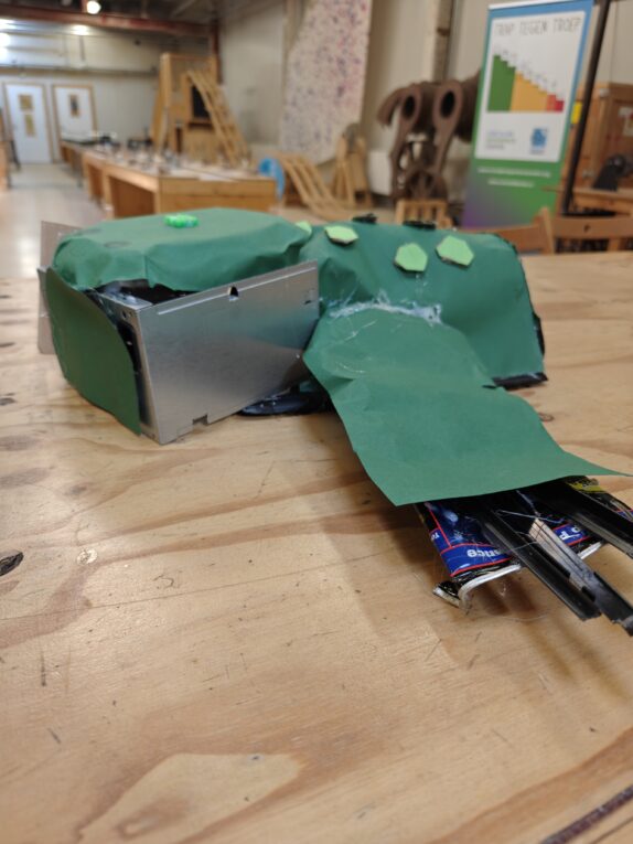 Het is een robot schildpad die afval opraapt met zijn grijphandem en dan eet die het op en komt het in zijn nep maag terrecht. En als die naar het land komt, dan recyclen we het.