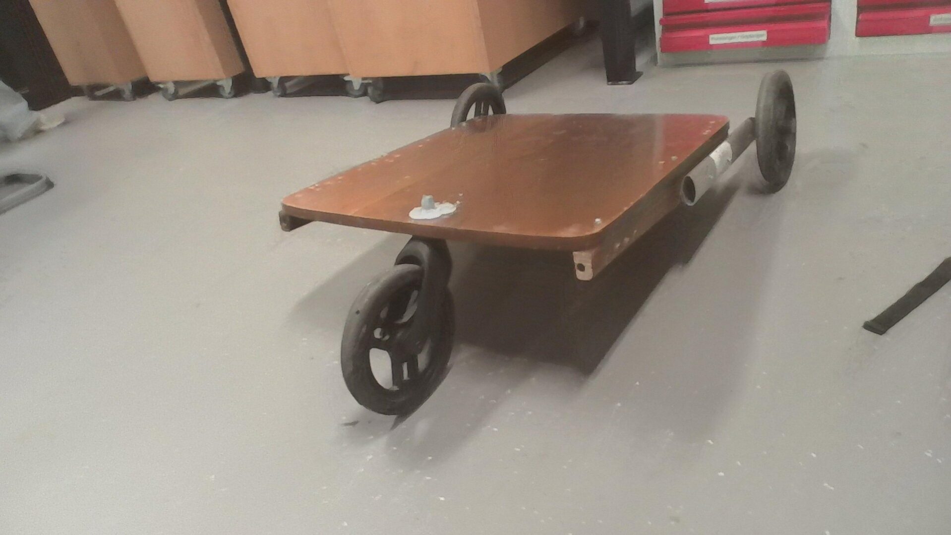 een houten frame van een tafel met wielen van een rolator