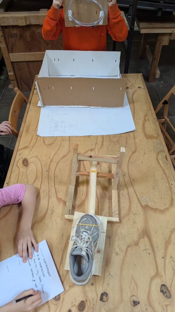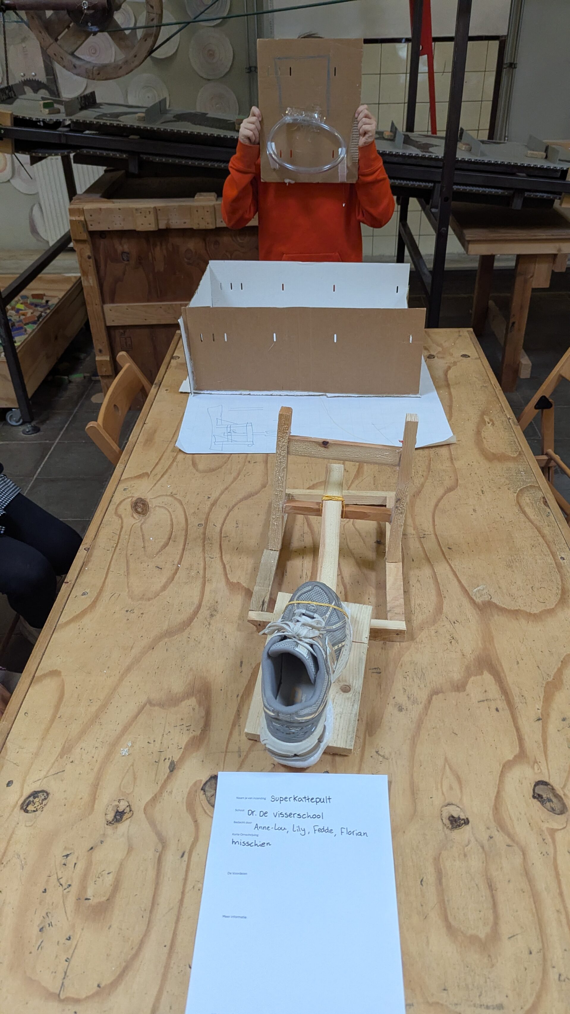 Hoe werkt het? Je drukt op een houten balk, waardoor jouw schoen gelanceerd wordt. Je moet je schoen in de basket mikken.